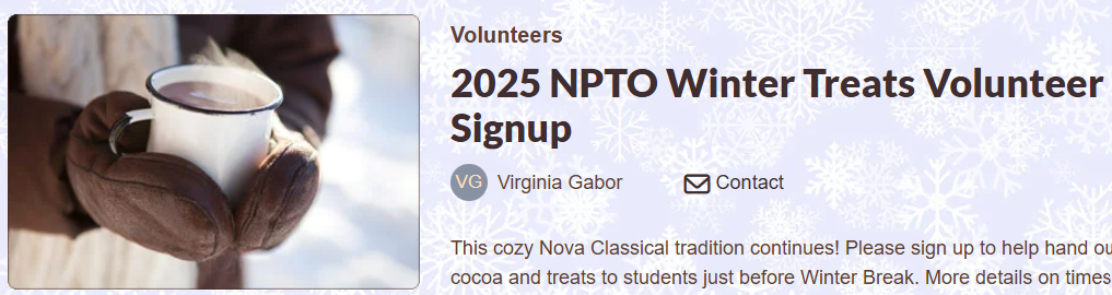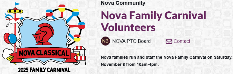 Every school year, each Nova family is encouraged to volunteer 20 hours for the school. If you have questions about volunteering, please contact Ms. Gabor at vgabor@novaclassical.org . Thank you!